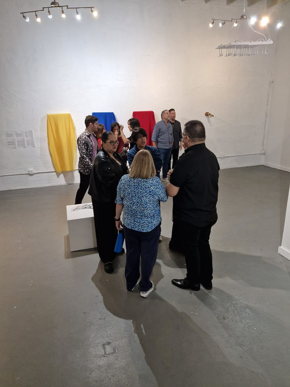 3 telas, una amarilla, una azul y una roja dispuestas de manera vertical haciendo alusión a nuestra bandera. A través de un sensor de movimiento al pasar frente a ellas las telas amarilla y azul se mueven por unos ventiladores conectados detrás, la roja no se inmuta.